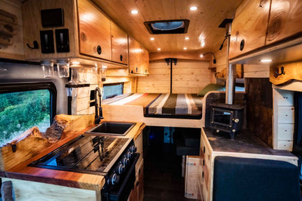 Cabin and wooden style interior with a wood stove makes this one a cabin on wheels. As per usual this is handcrafted details and so much custom work put into it.